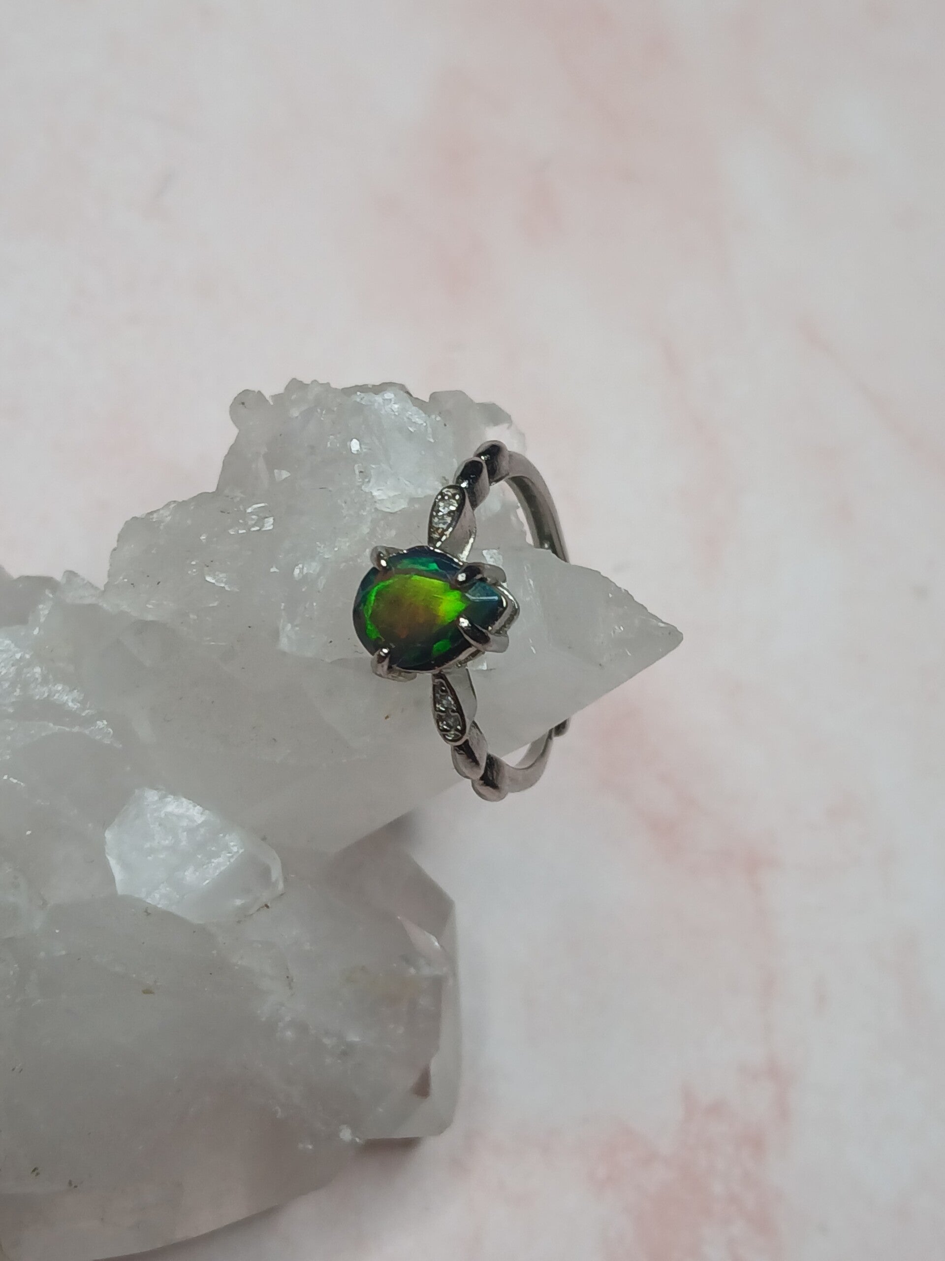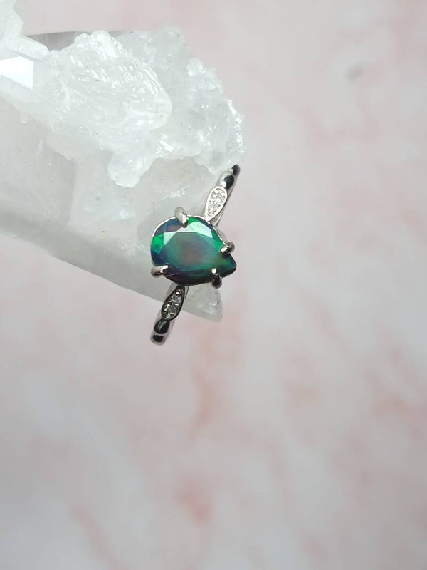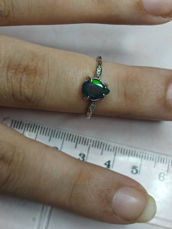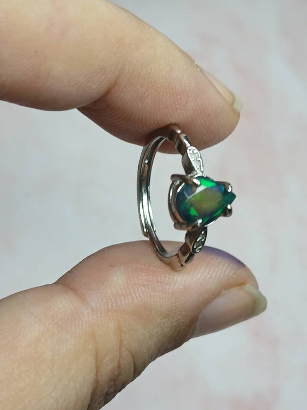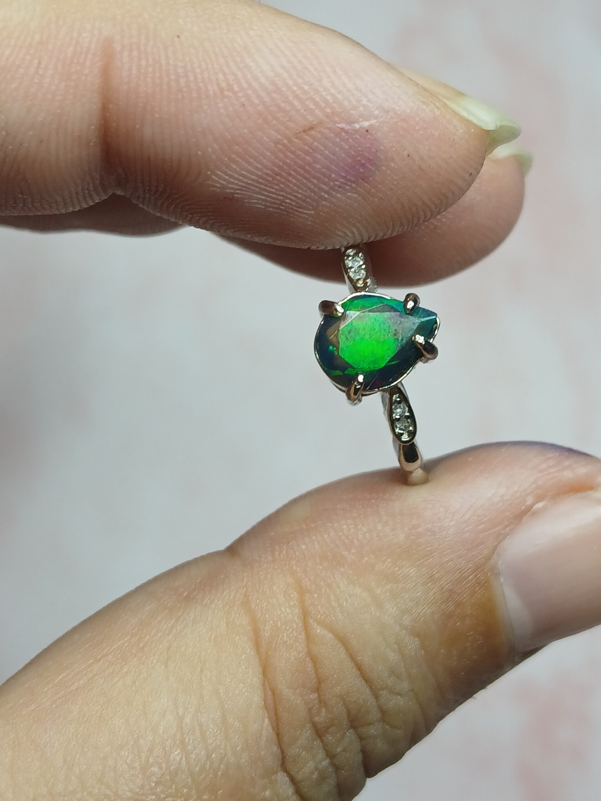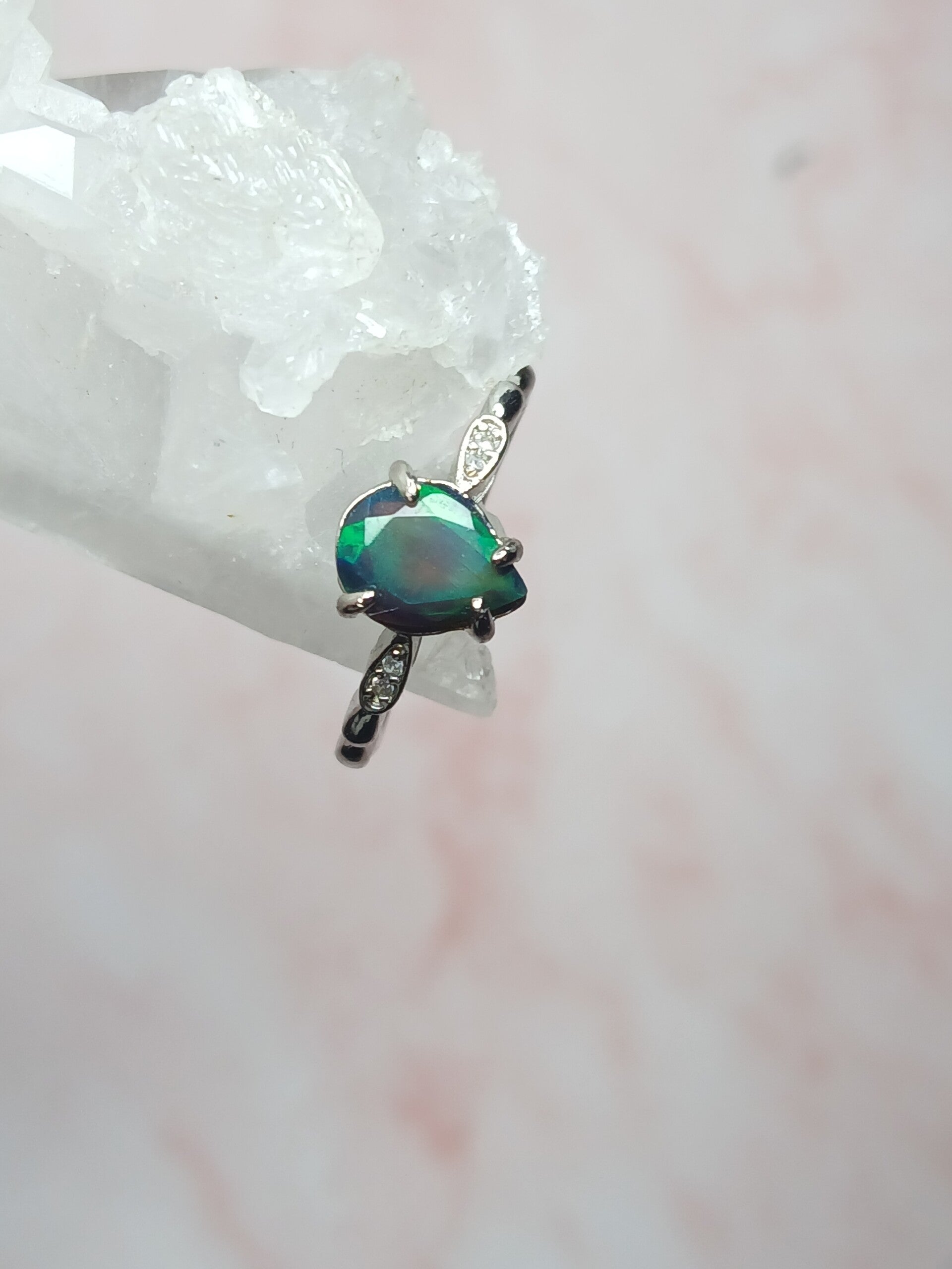 Opale smock Éthiopienne. Facettes format goutte de 8x5mm. Noire cristaline avec flash vert fort sur la facette centrale.