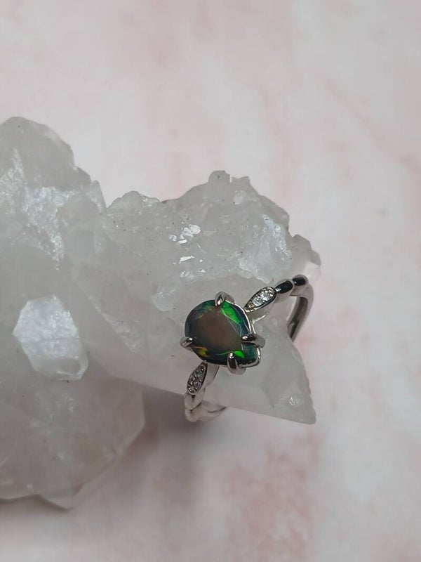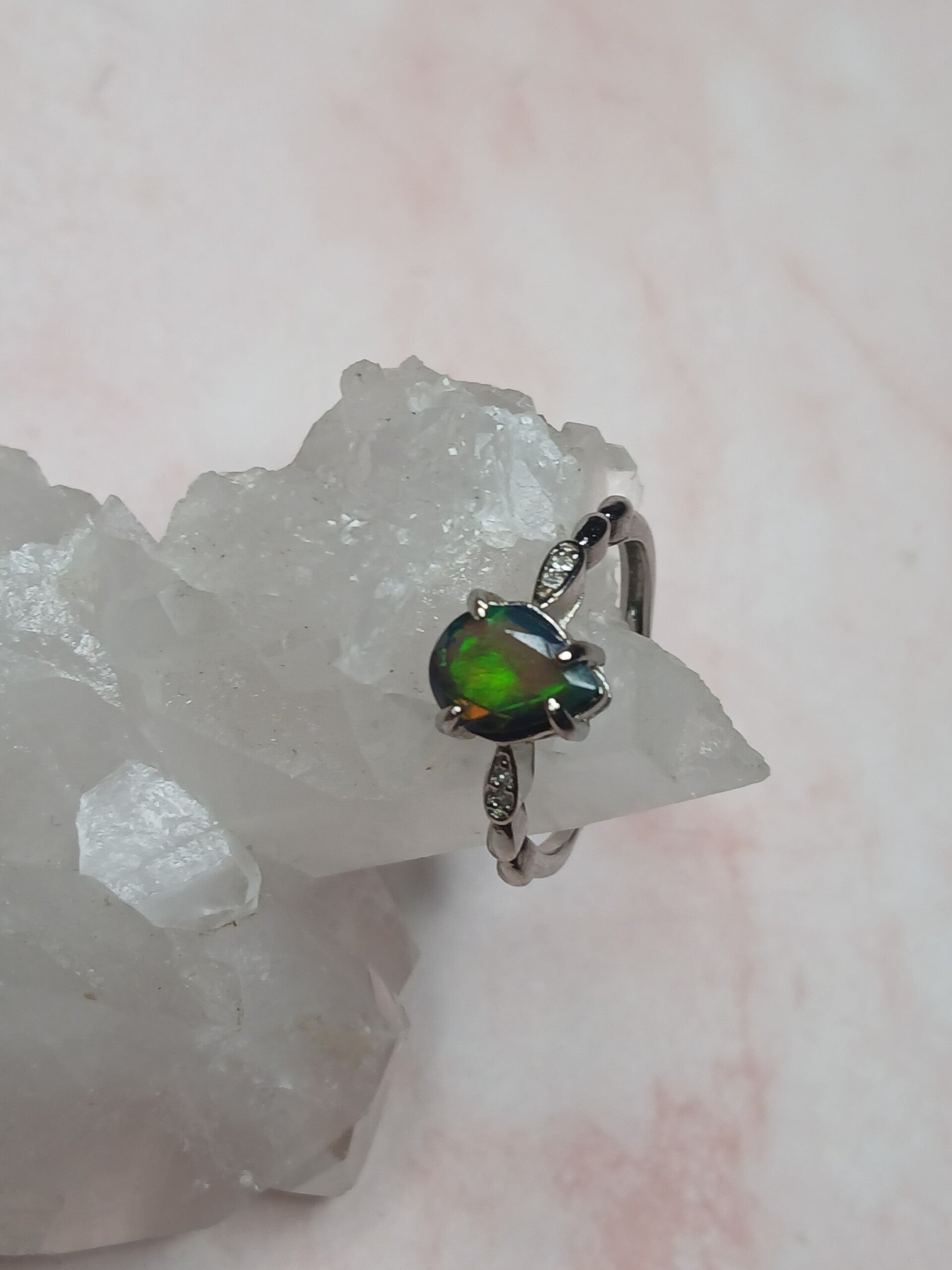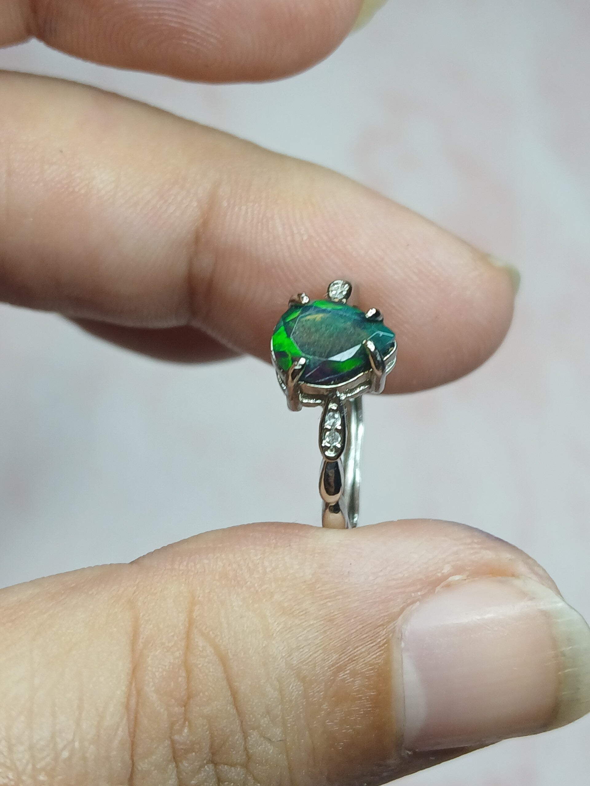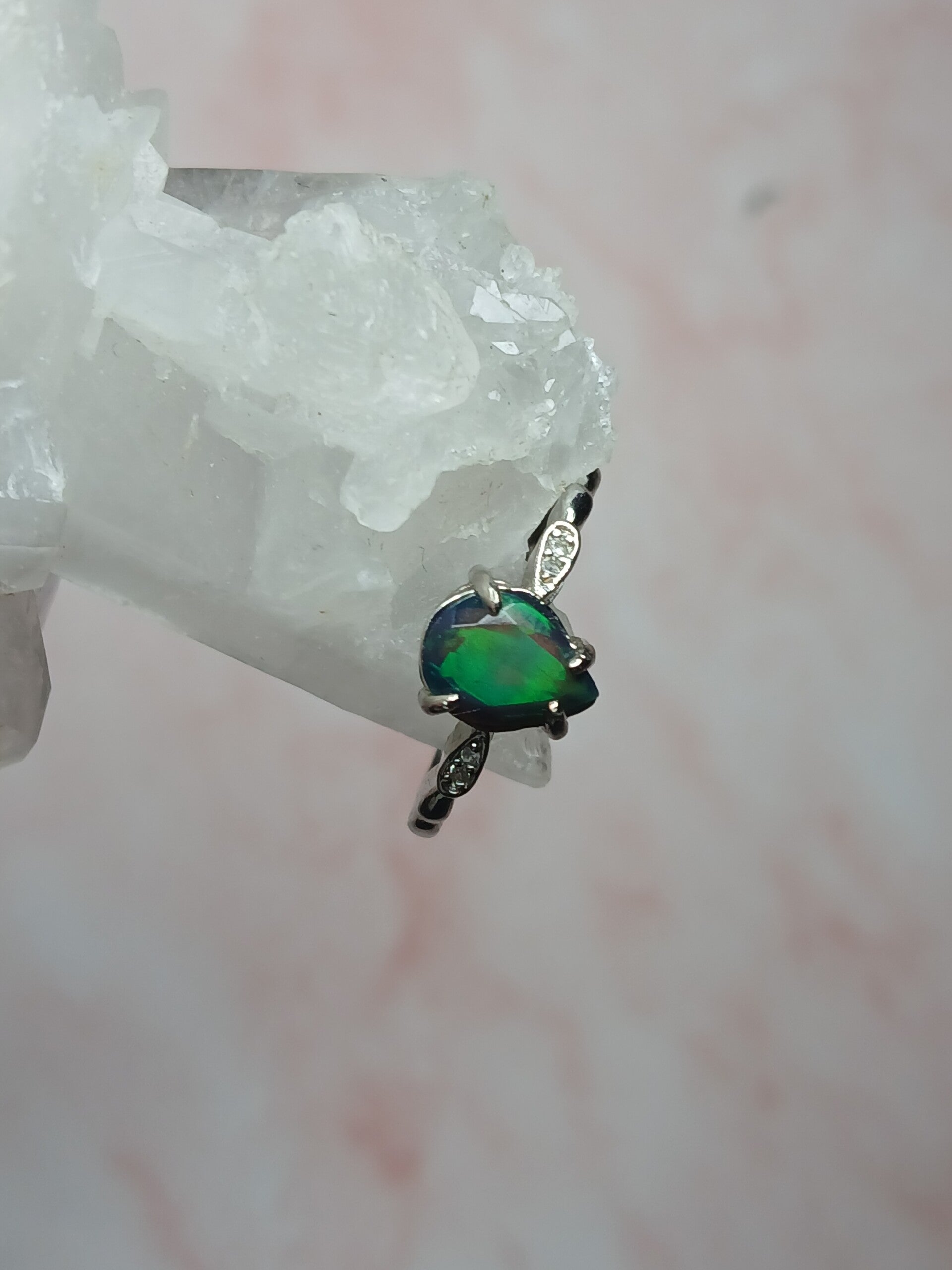 Opale smock Éthiopienne. Facettes format goutte de 8x5mm. Noire cristaline avec flash vert fort sur la facette centrale.