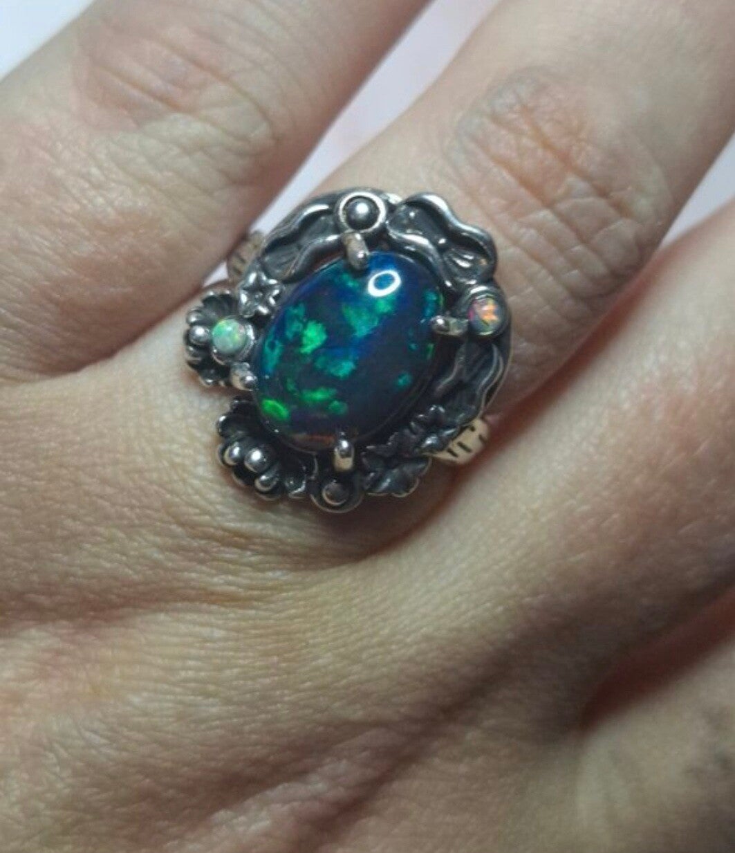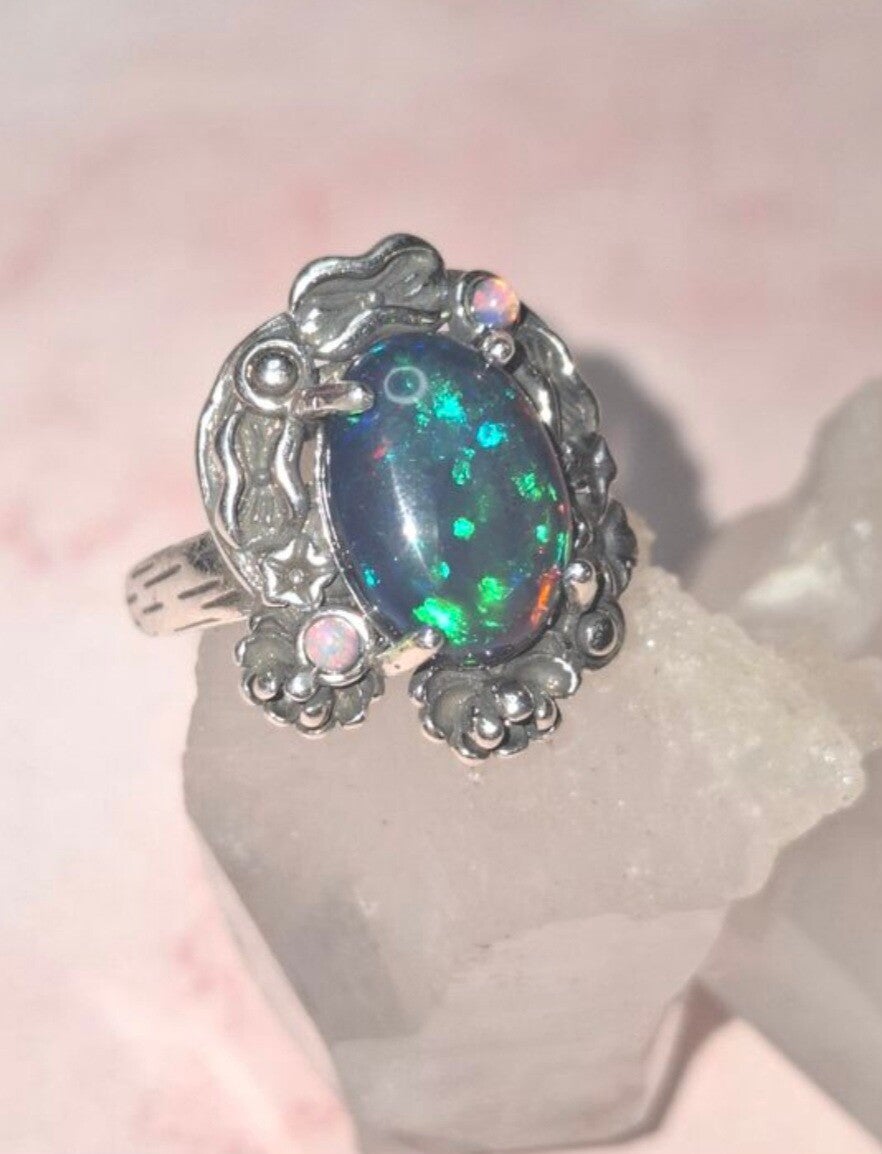 Bague style vintage, ajustable et opale 14x10mm de 2,35 carats smock bleuté vert éthiopienne