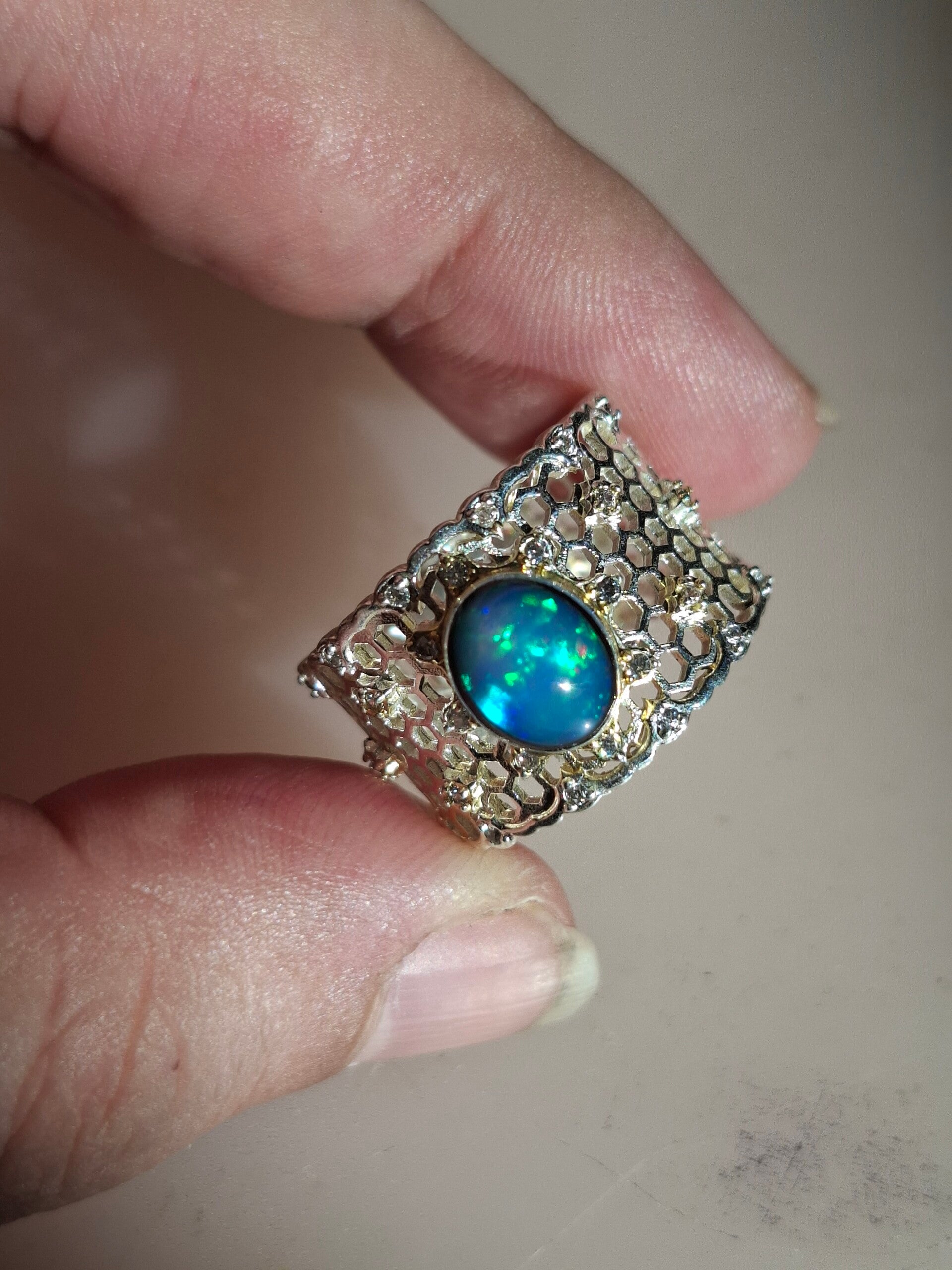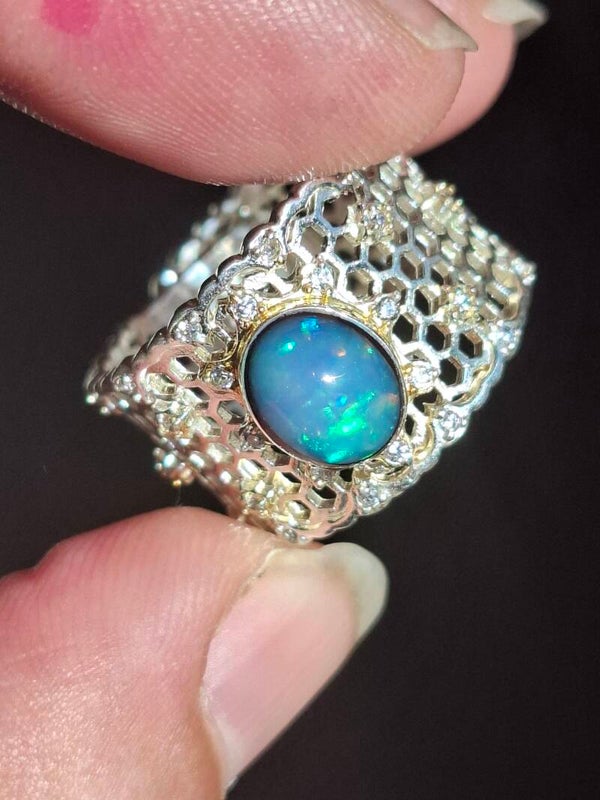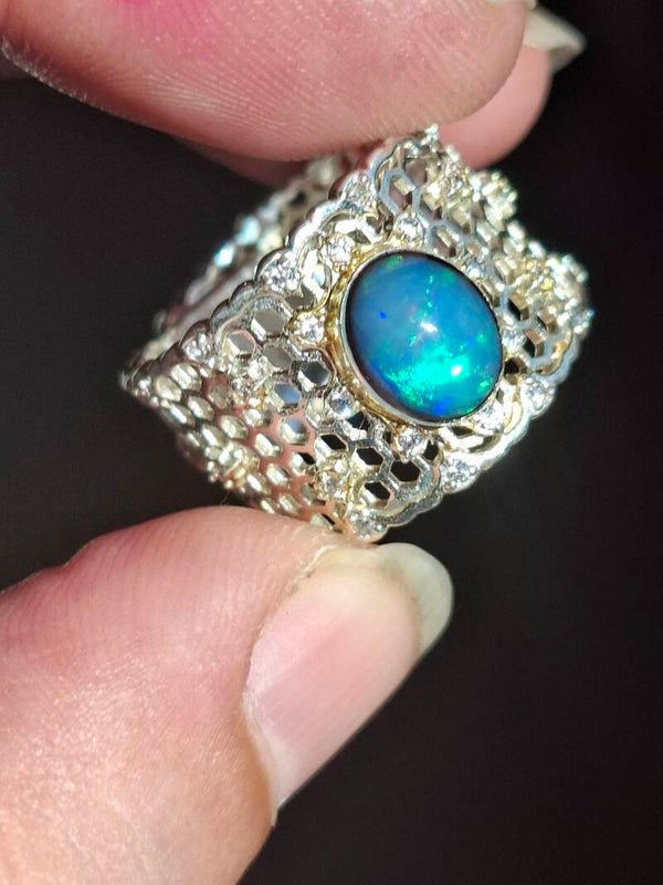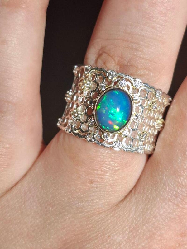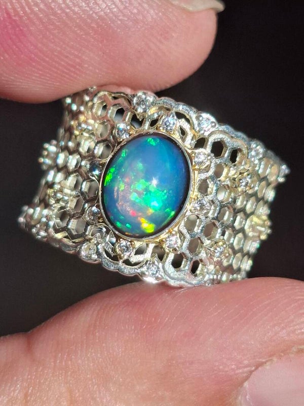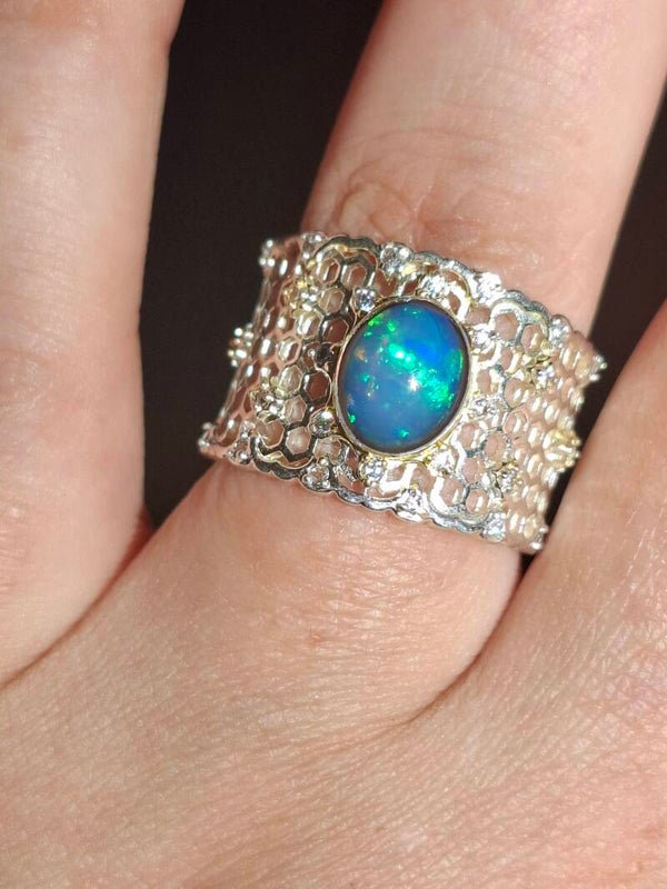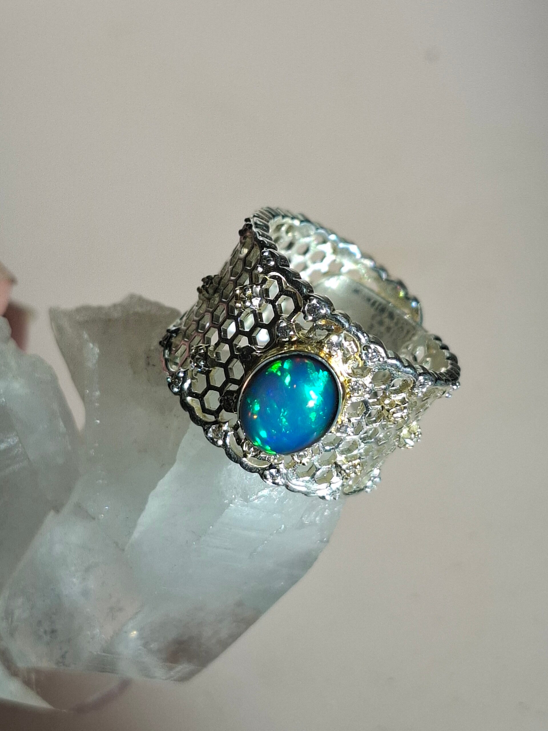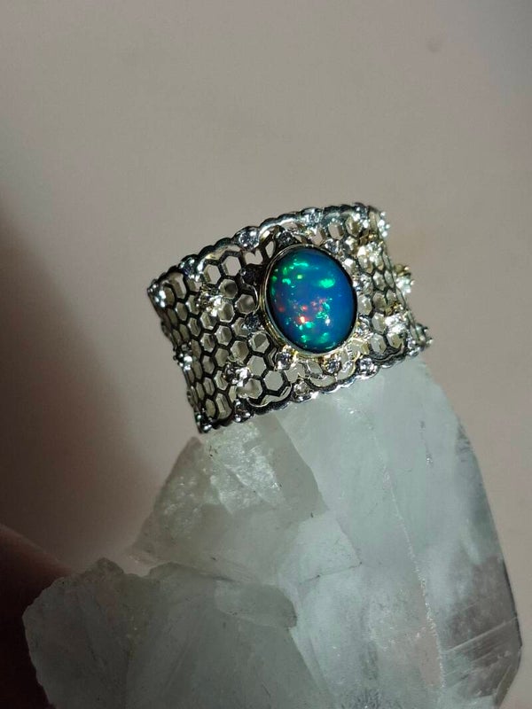Bague ajustable opale 8x6mm welo pailleté arc en ciel