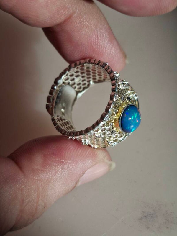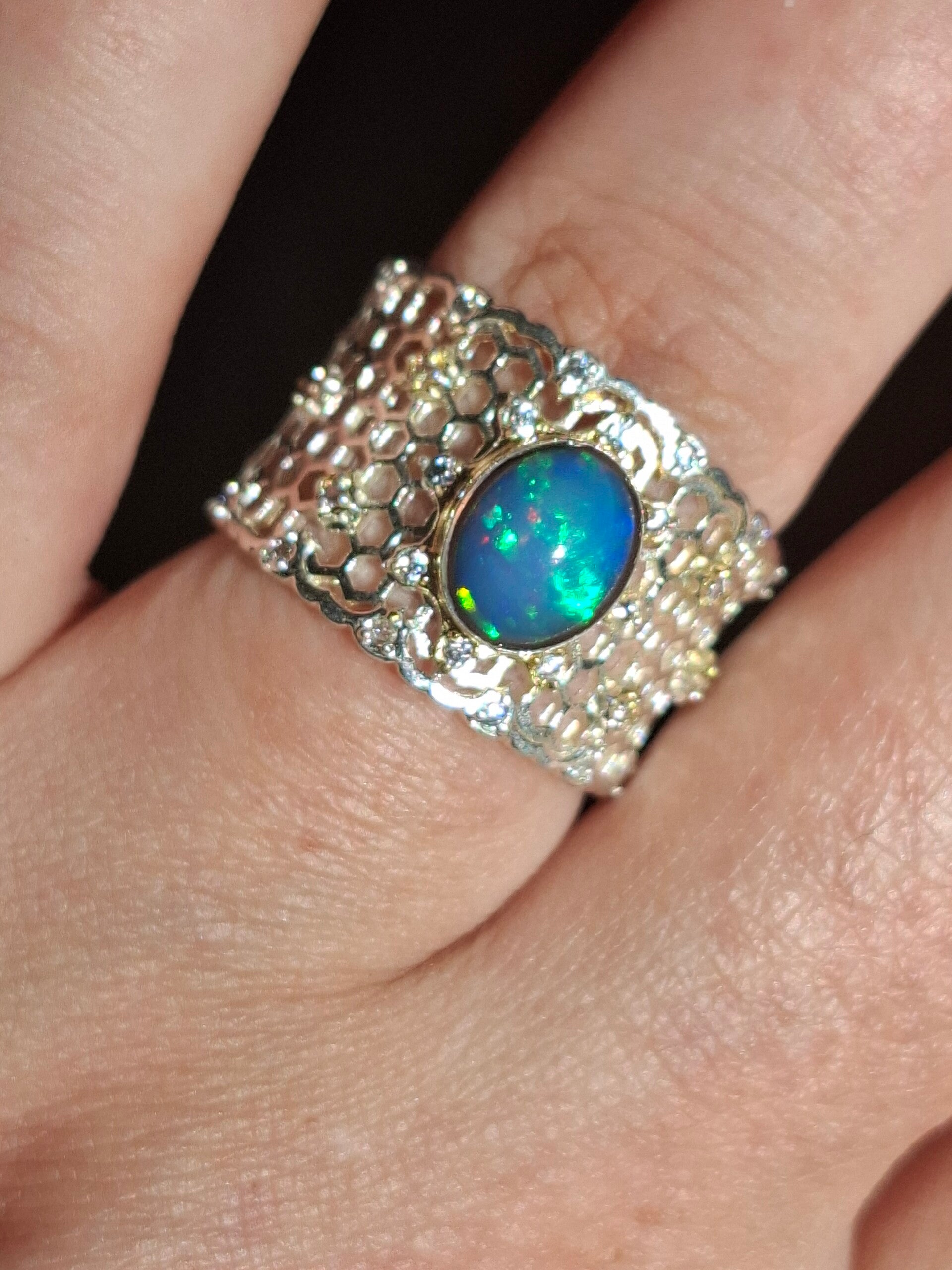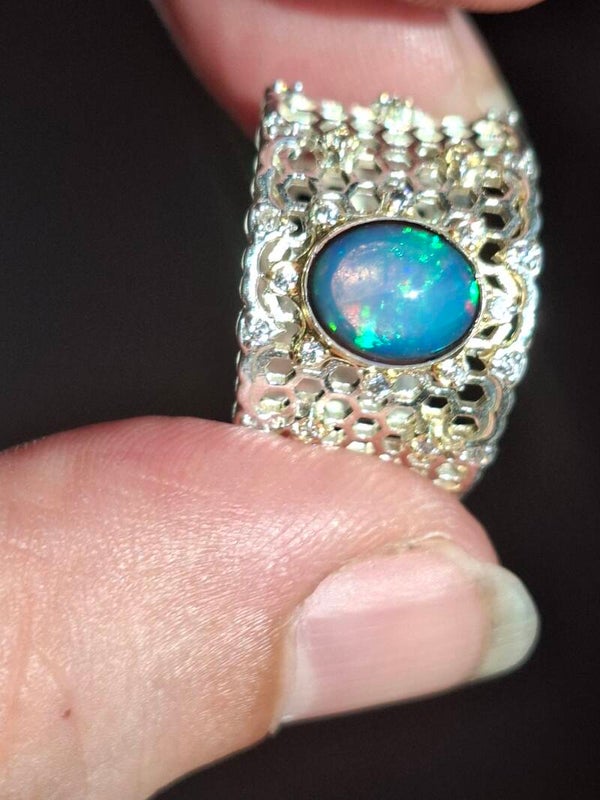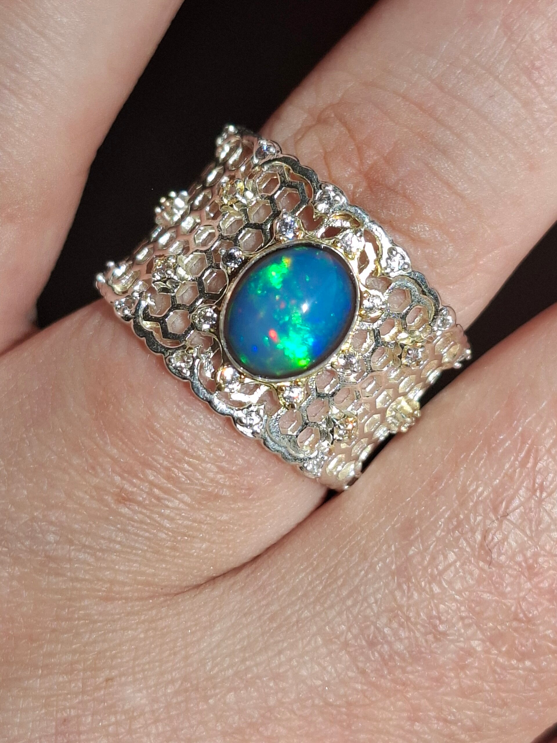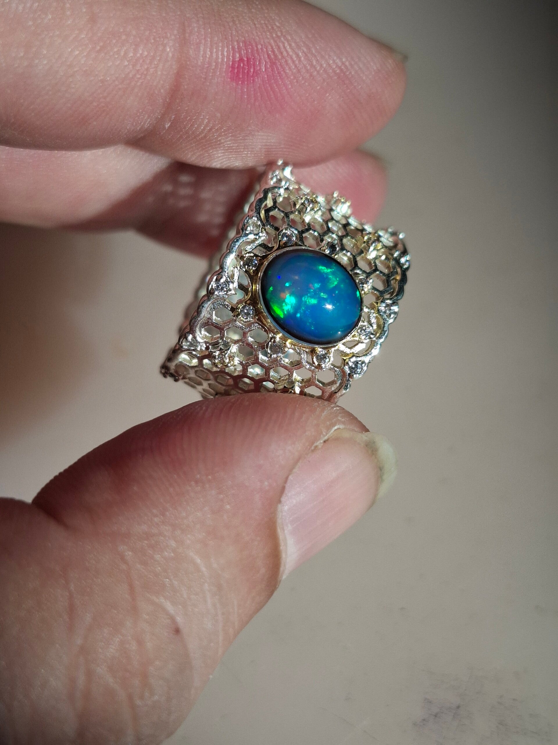 Bague ajustable opale 8x6mm welo pailleté arc en ciel