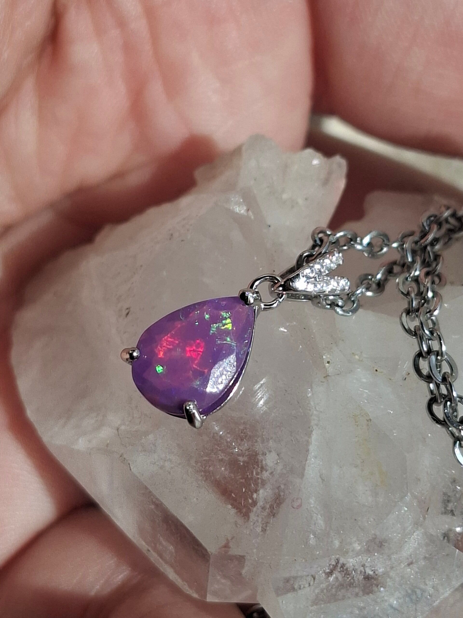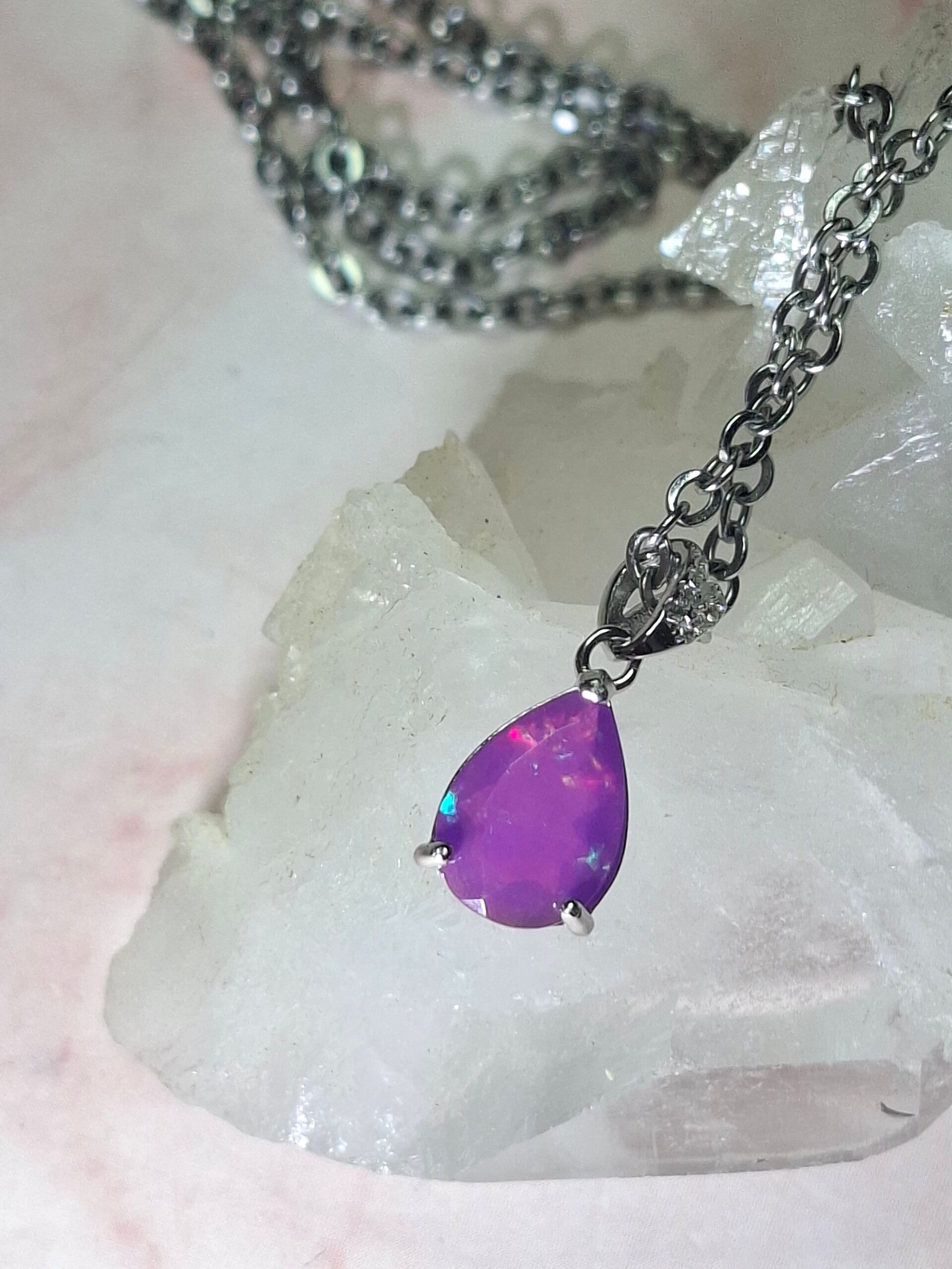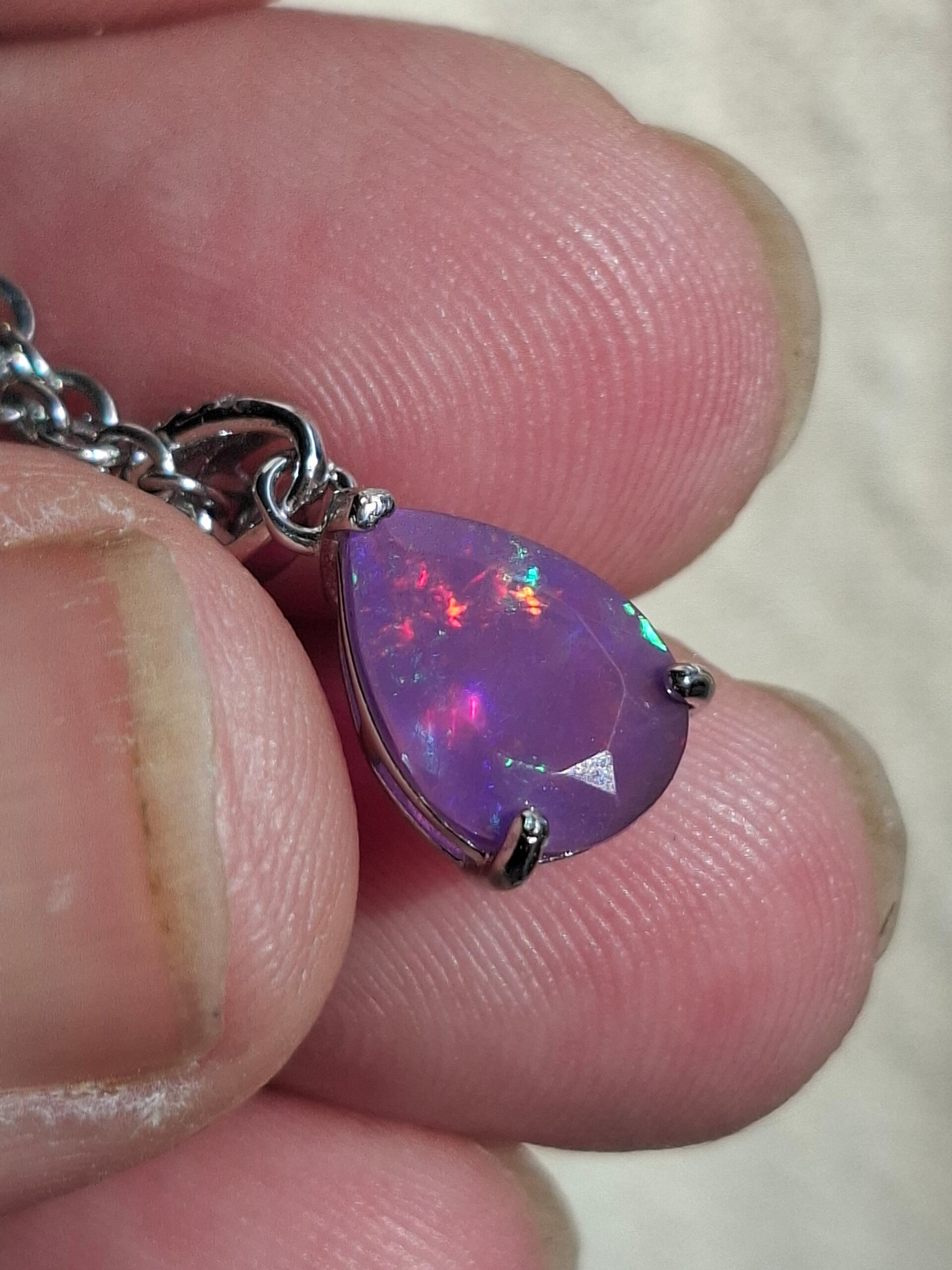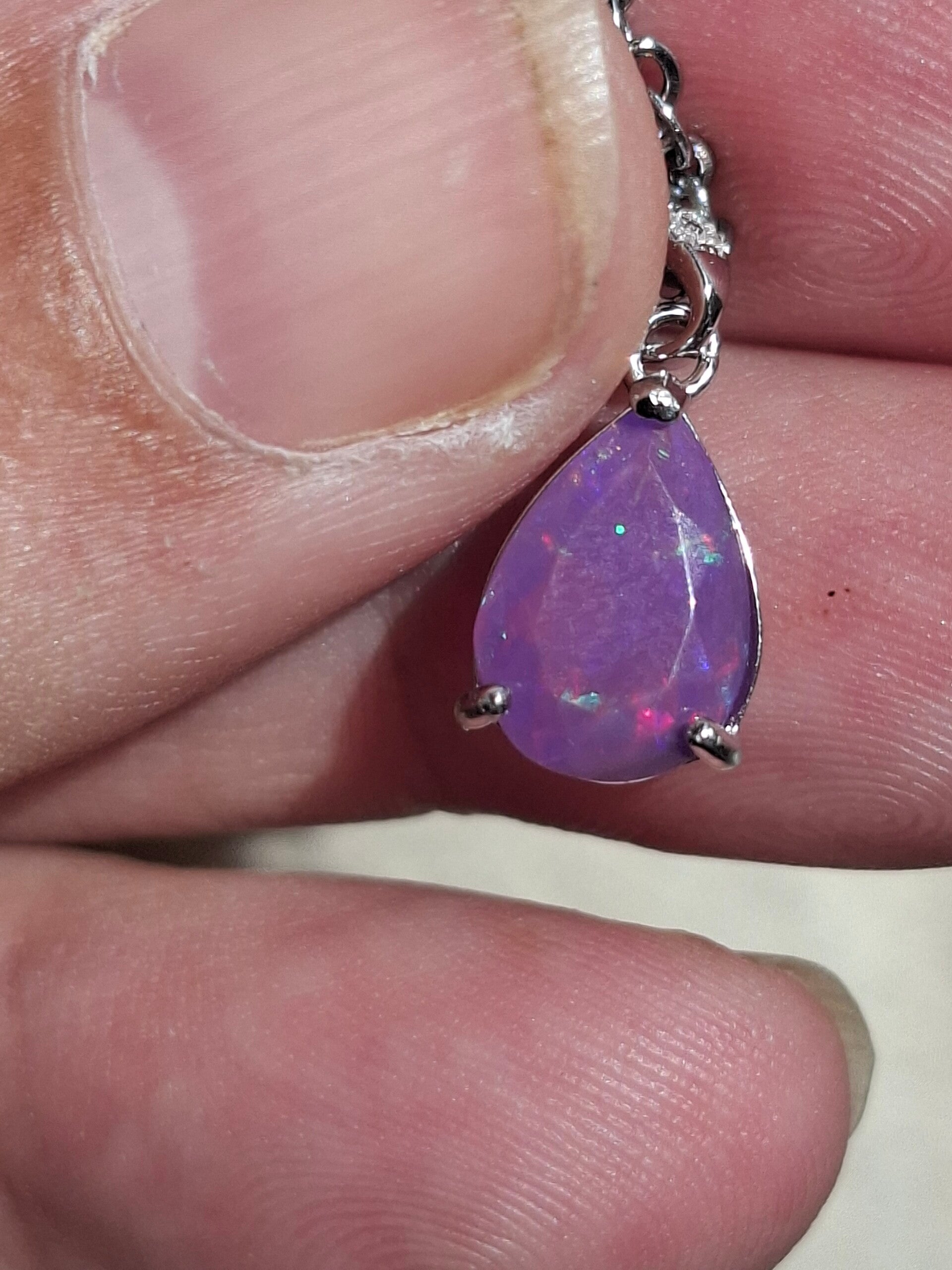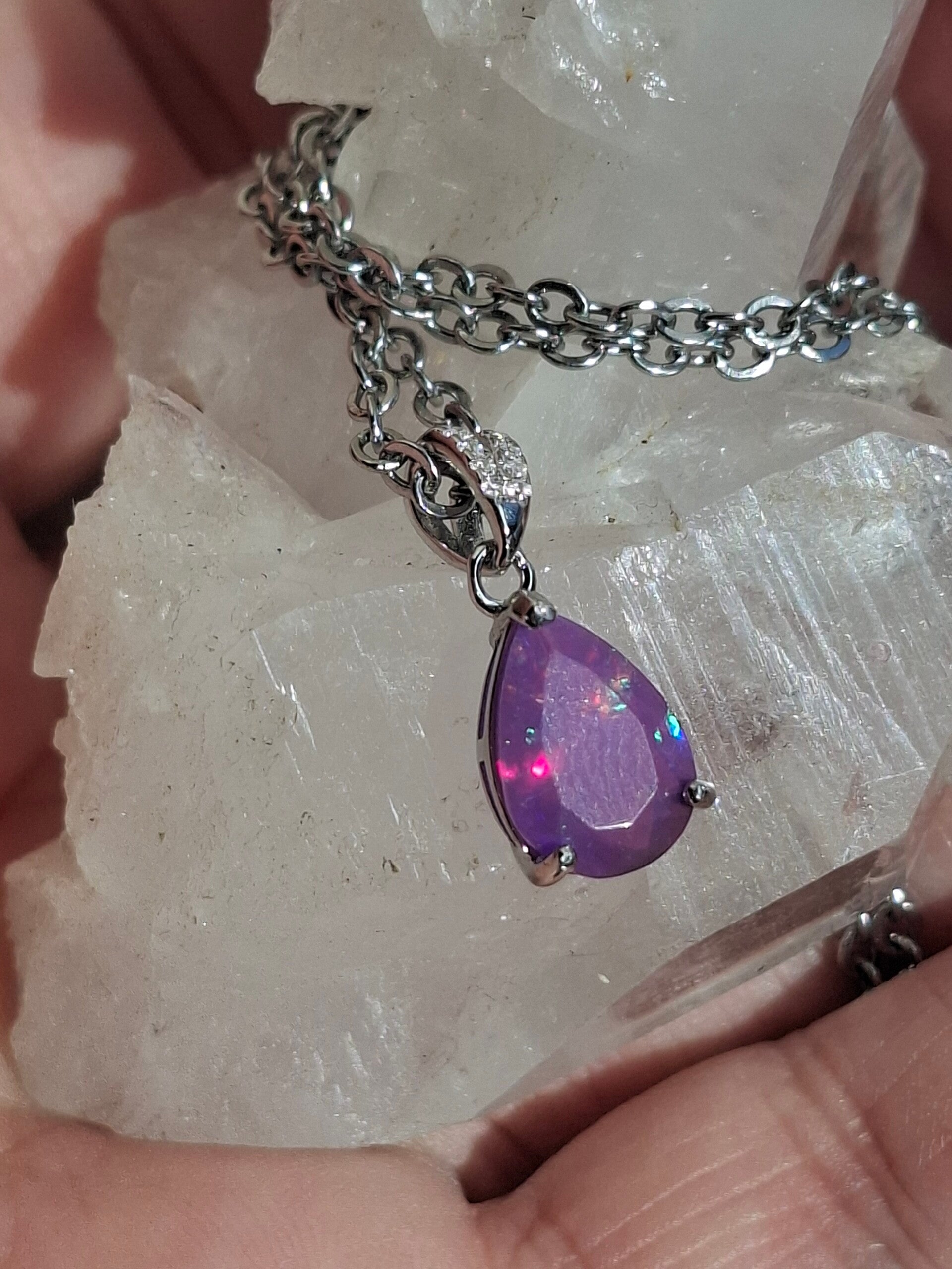 Neuf. Pendentif s925 zircon avec opale facetté goutte mauve reflet multicolore