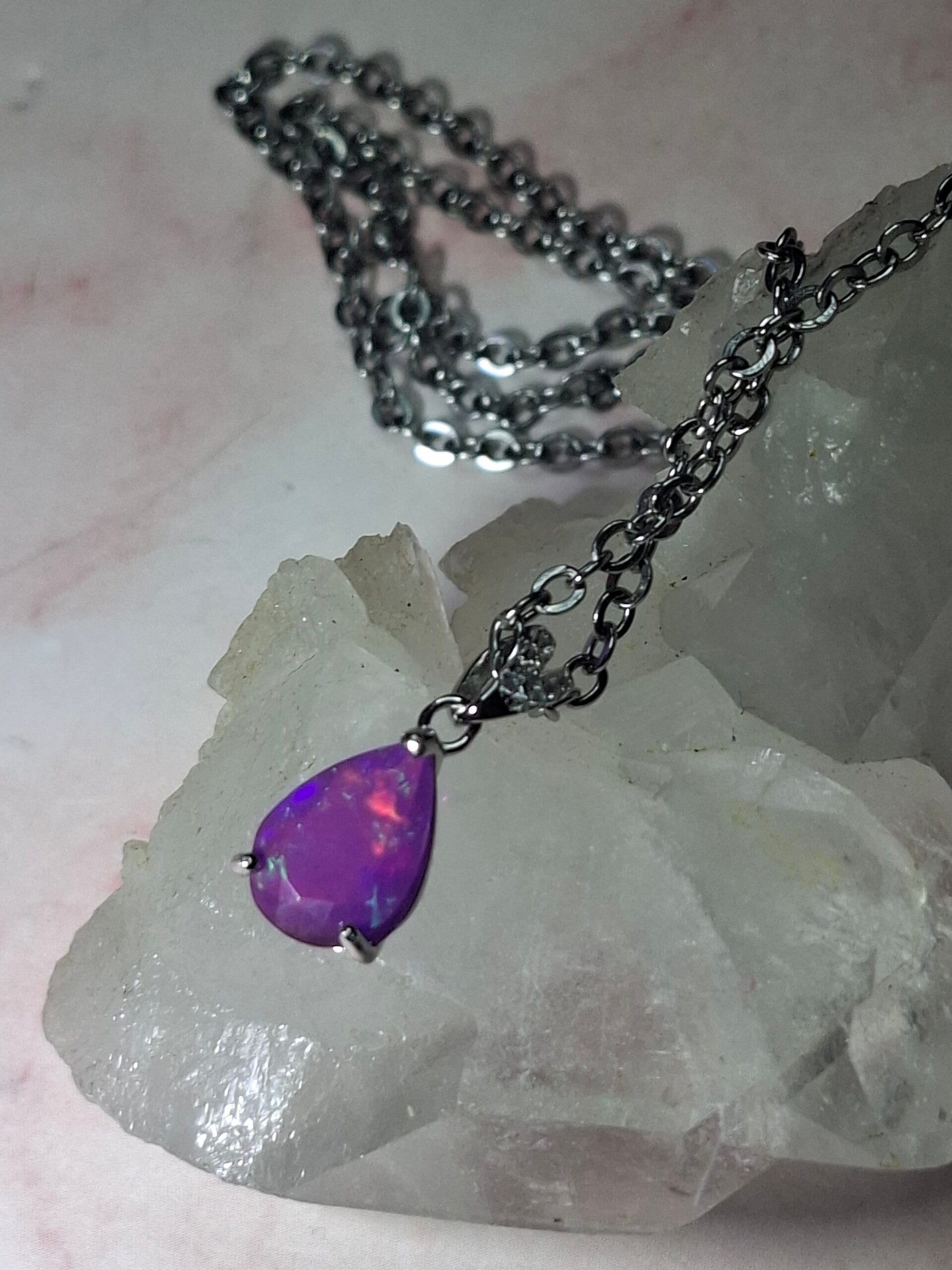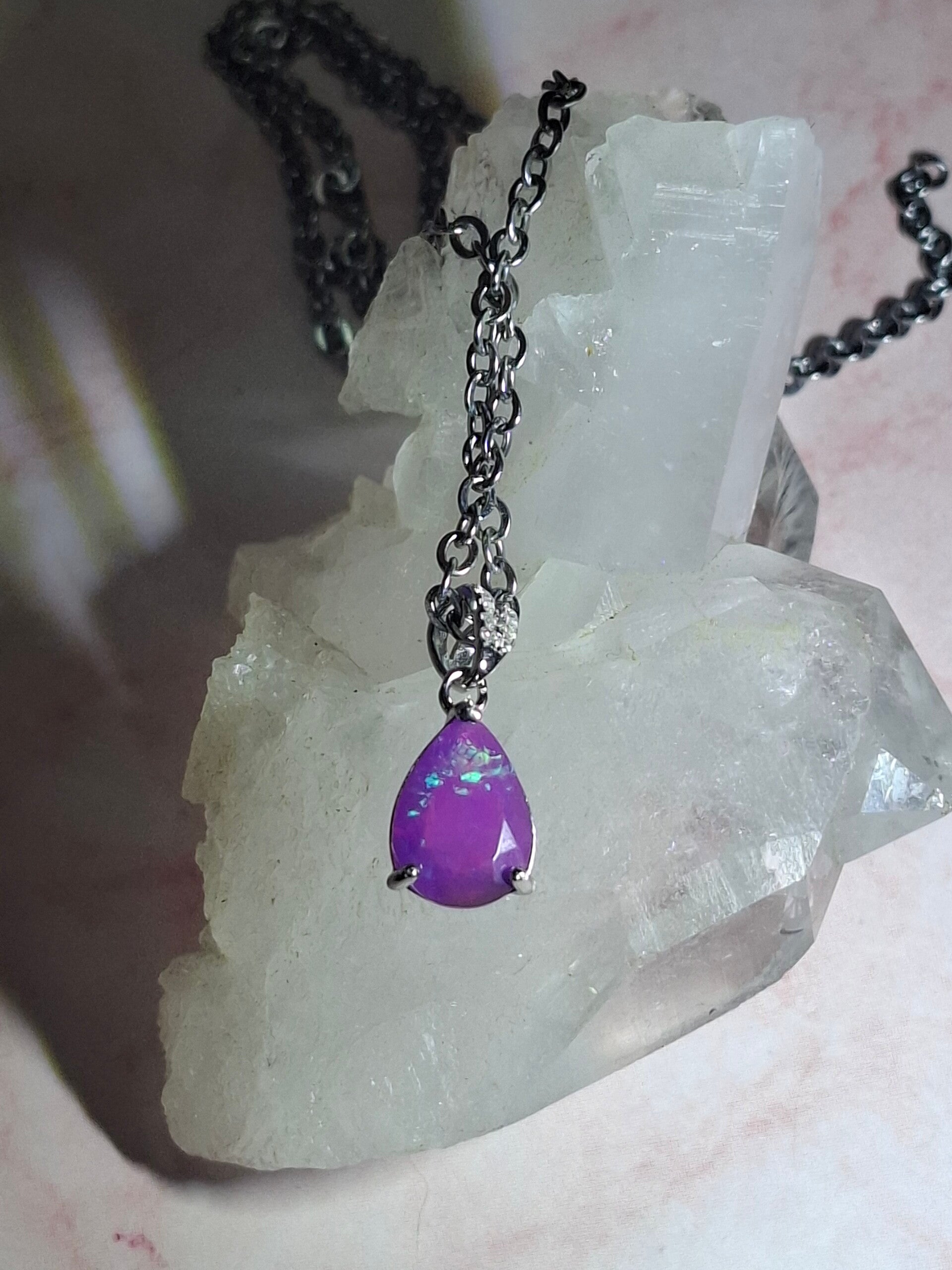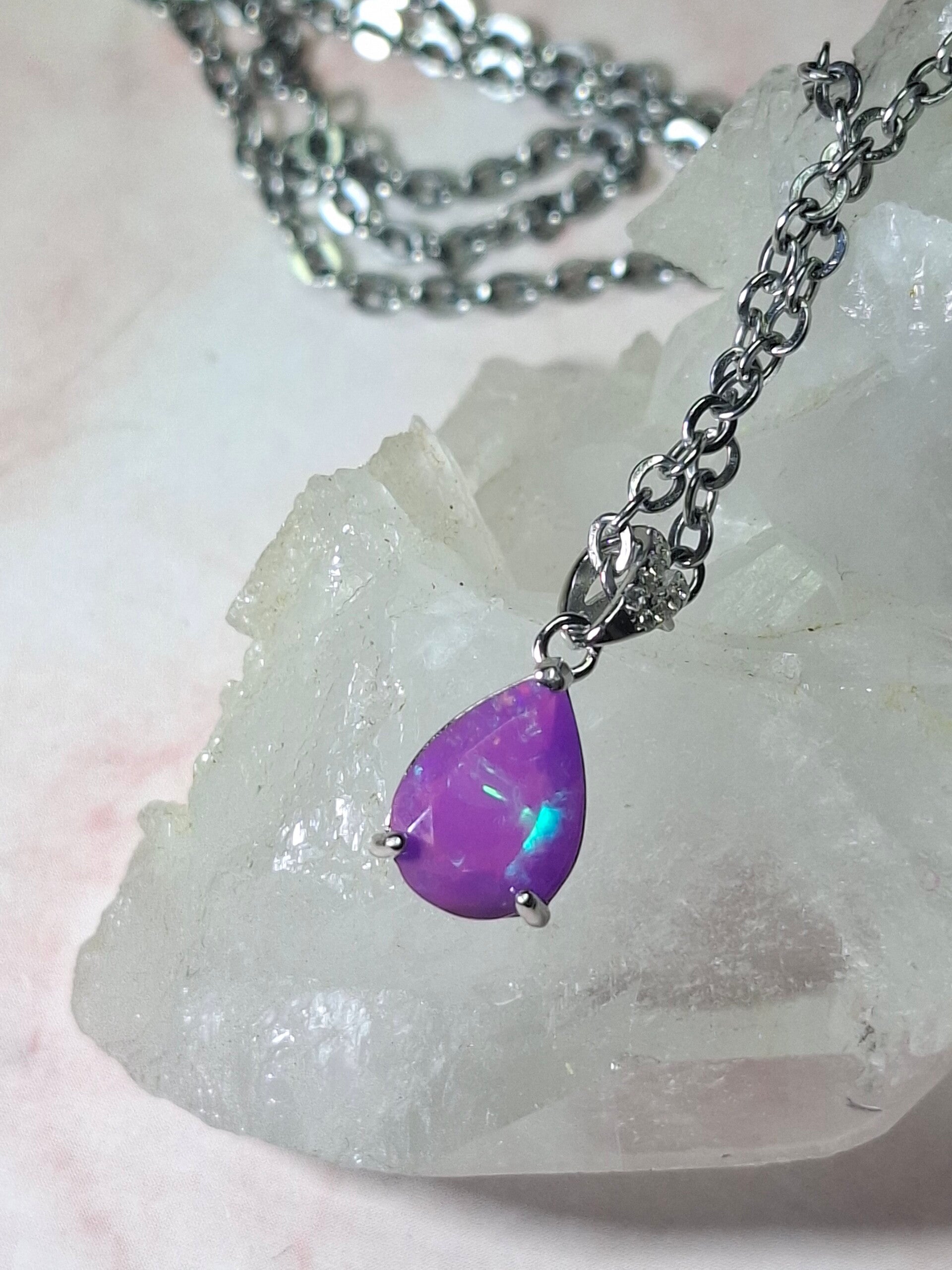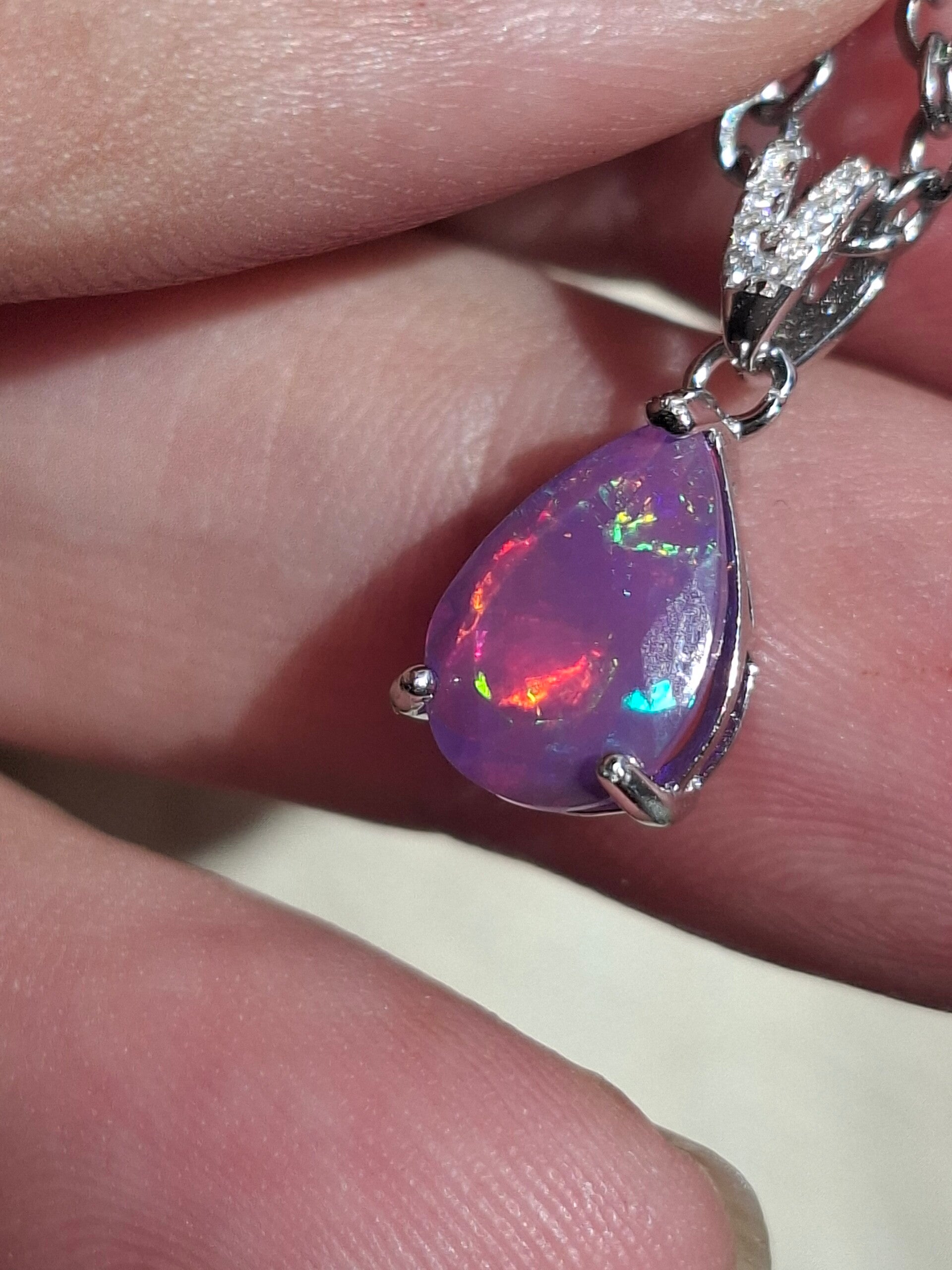 Neuf. Pendentif s925 zircon avec opale facetté goutte mauve reflet multicolore