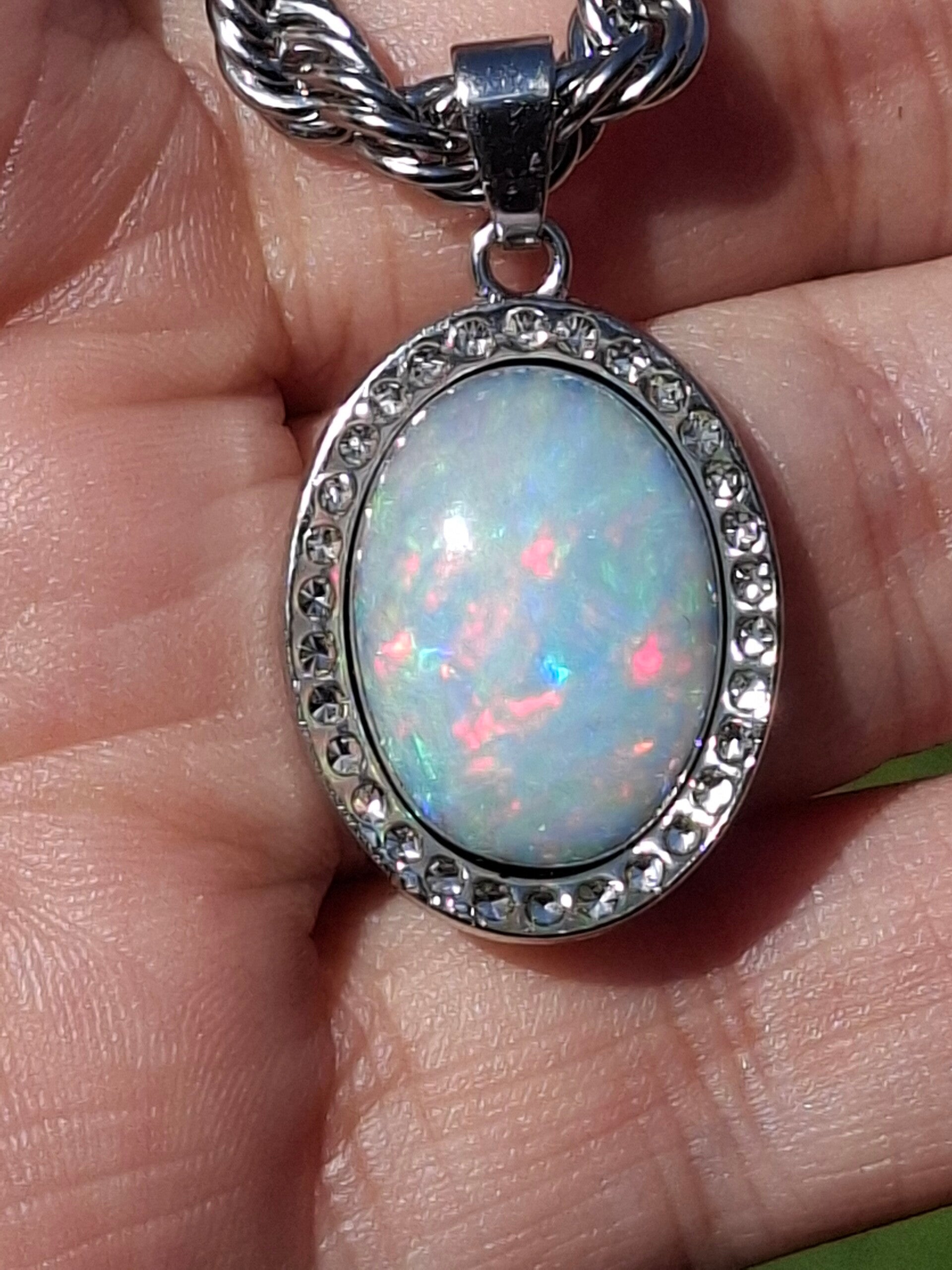 Pierre véritable. Blanc nacré avec reflet multicolore.