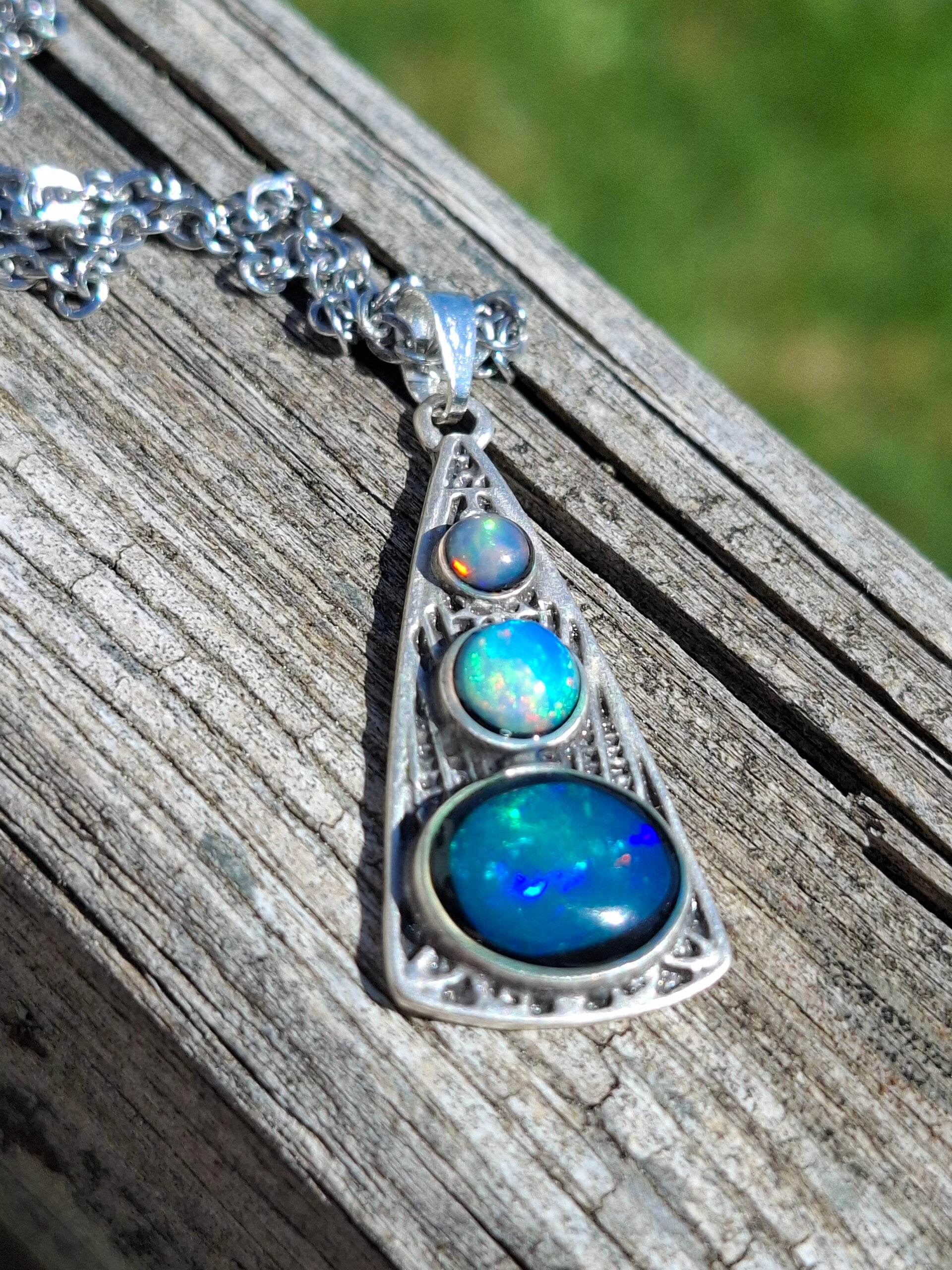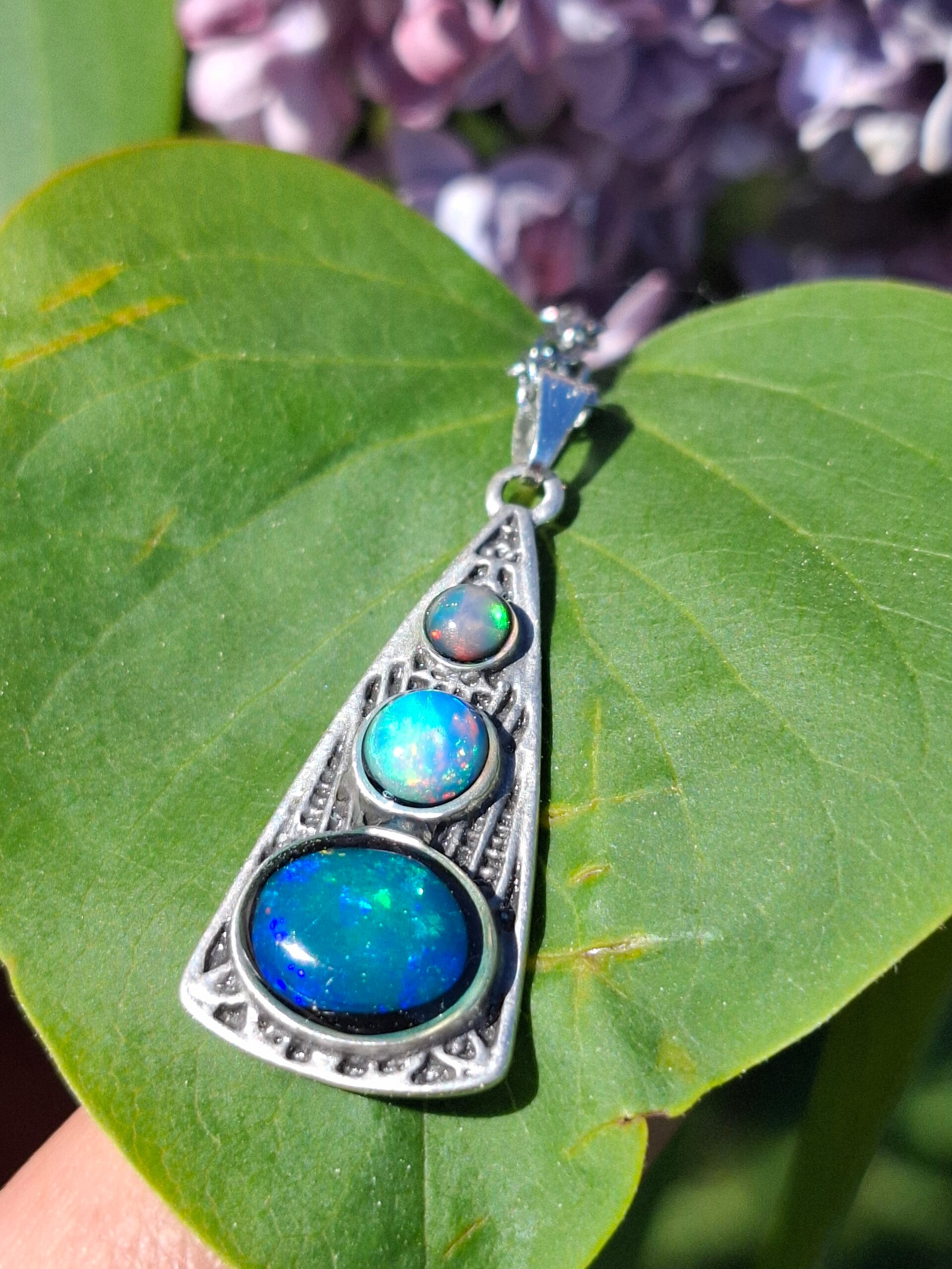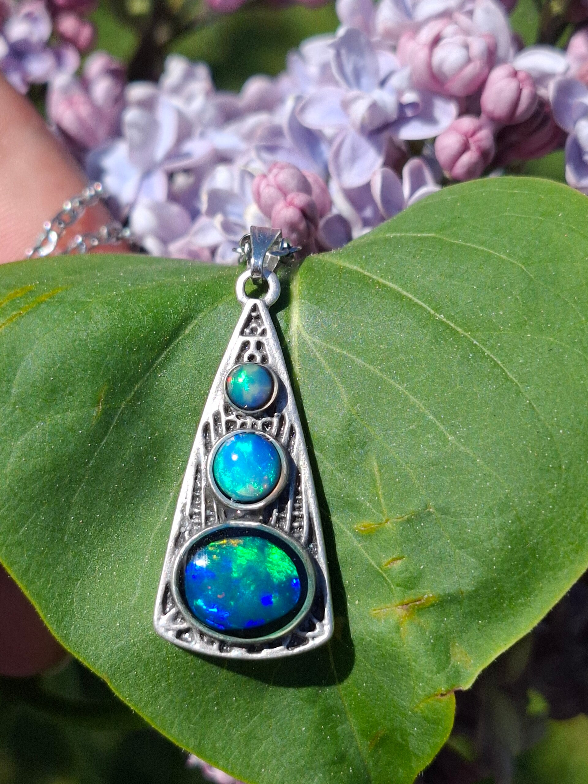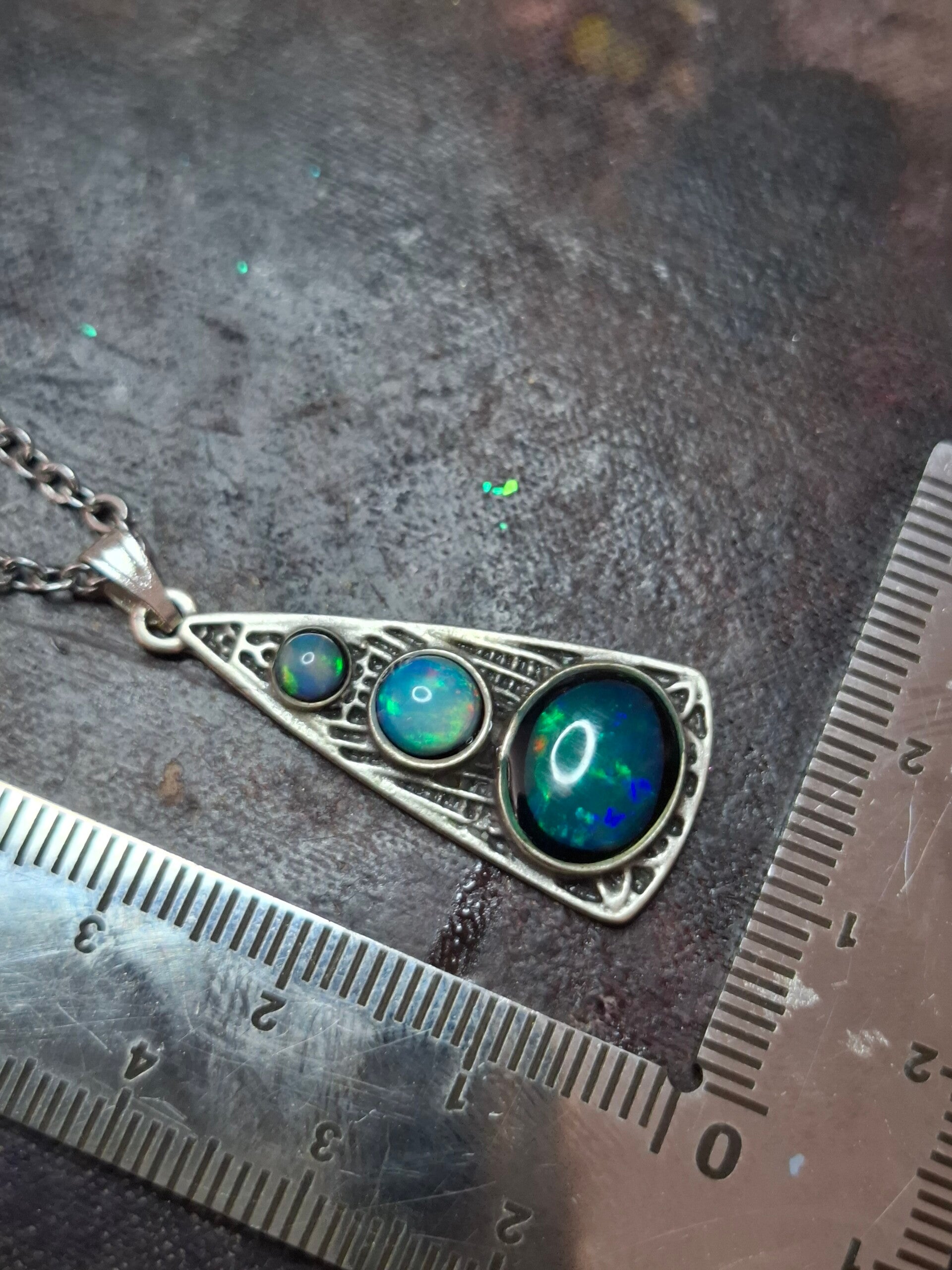 Pendentif 3 opales, pierres de 2, 6 et 9x7mm, éthiopienne, reflet multicolore