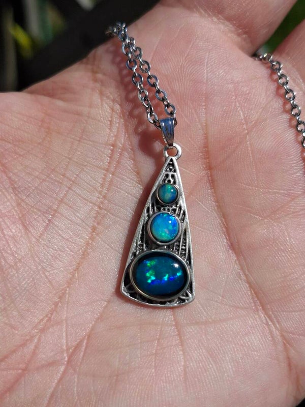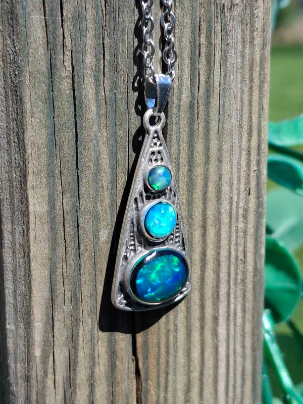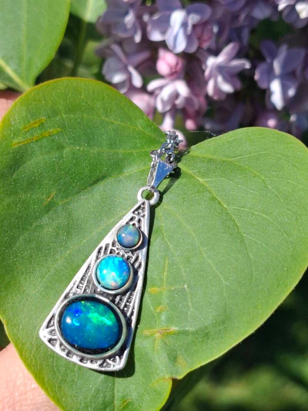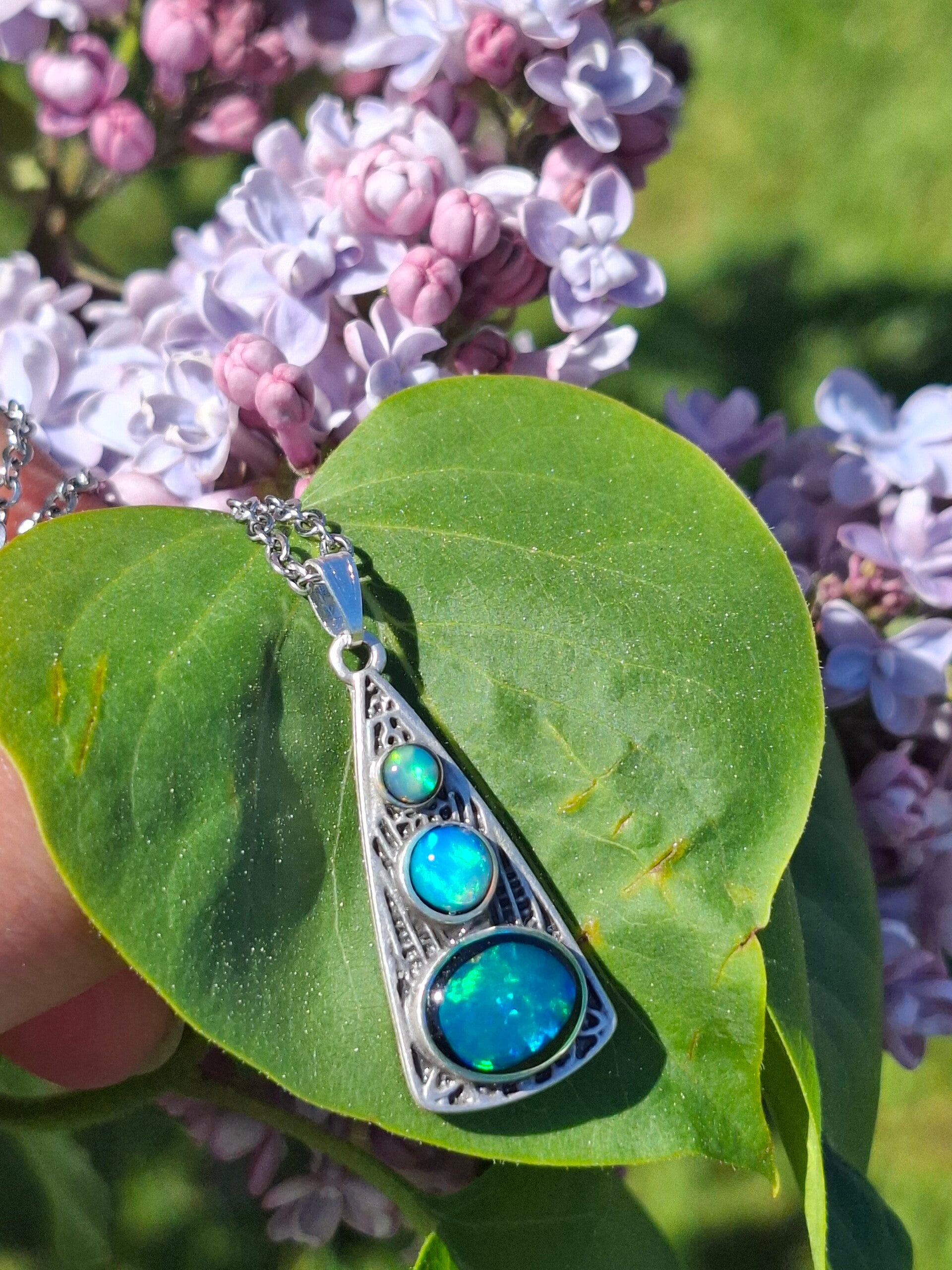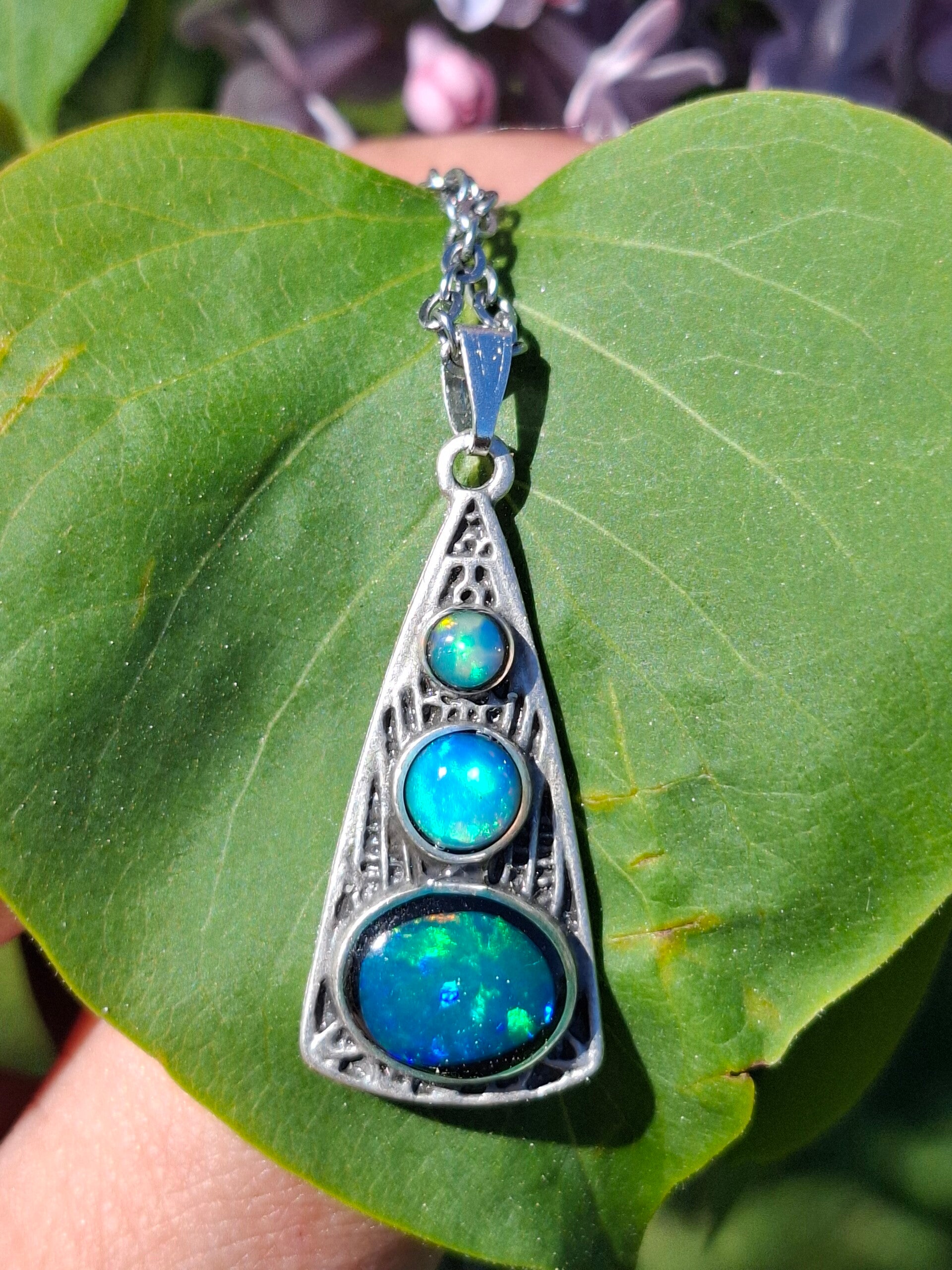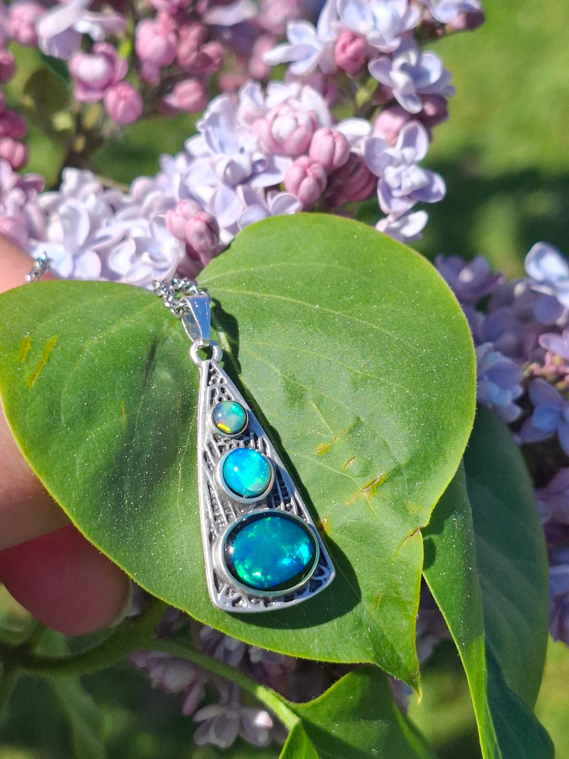 Pendentif 3 opales, pierres de 2, 6 et 9x7mm, éthiopienne, reflet multicolore